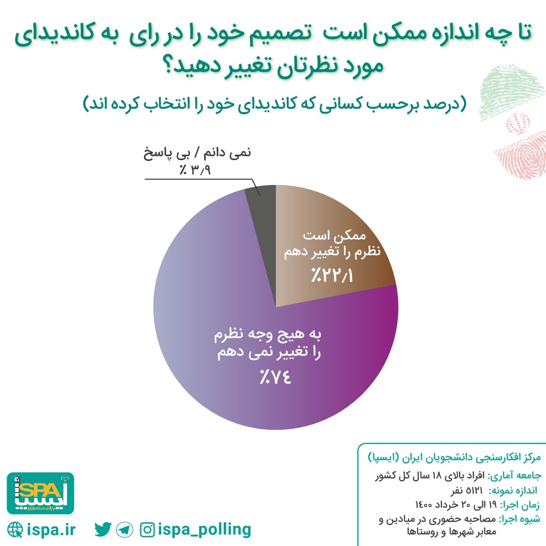 از بین افرادی که نامزد موردنظر خود را انتخاب کرده‌اند، ۷۴ درصد گفته اند به هیچ وجه نظرشان را تغییر نمی‌دهند و در مقابل ۲۲.۱ درصد گفته‌اند ممکن است نظرشان را تغییر دهند. ۳.۹ درصد نیز گفته‌اند نمی‌دانند یا به این پرسش پاسخ نداده‌اند.
