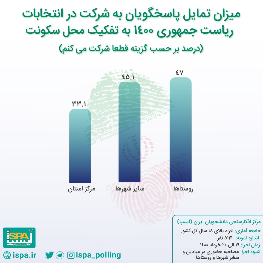 تمایل به مشارکت قطعی در انتخابات در مراکز استان‌ها ۳۳.۱ درصد، در سایر شهرها ۴۵.۱ درصد و در روستاها ۴۷ درصد است.