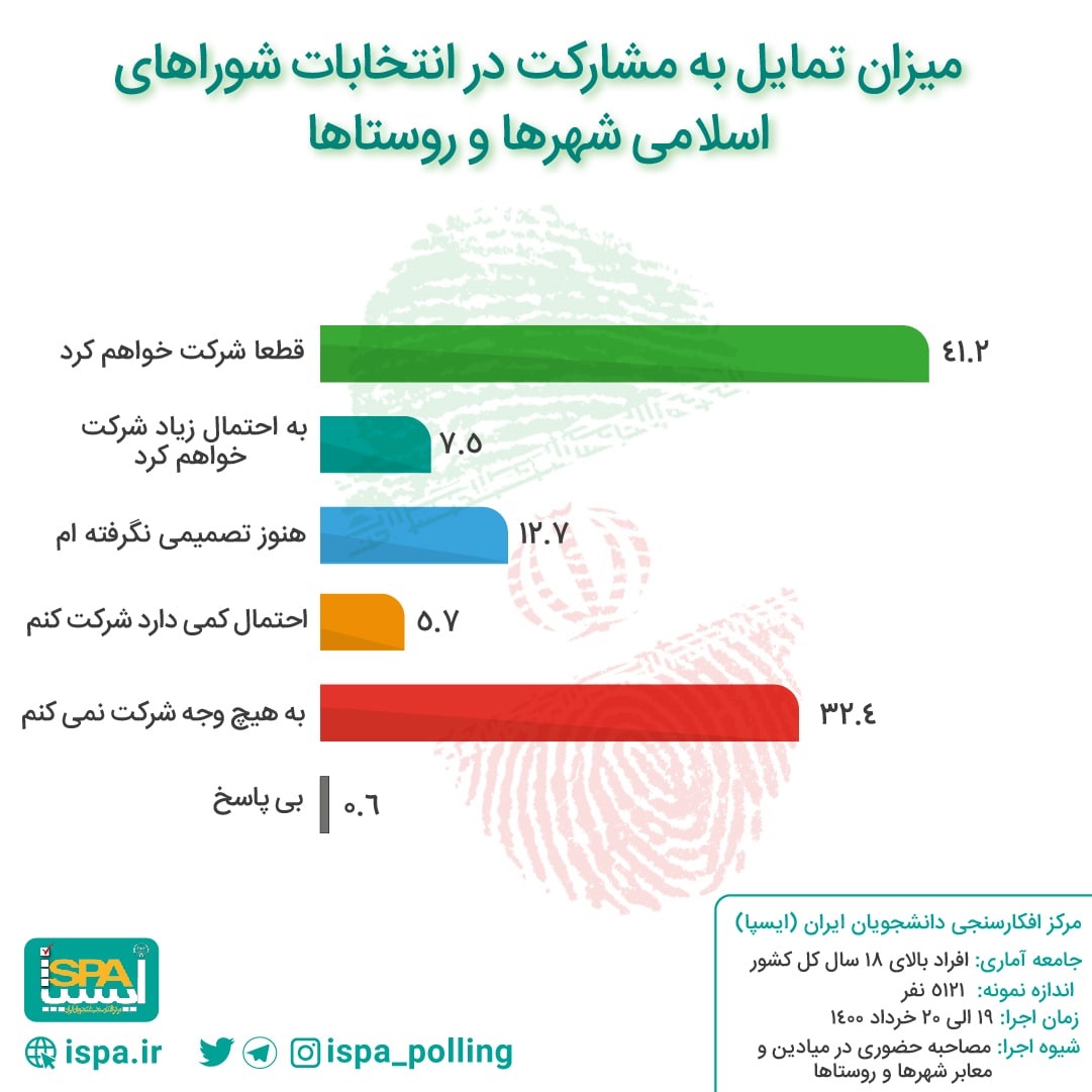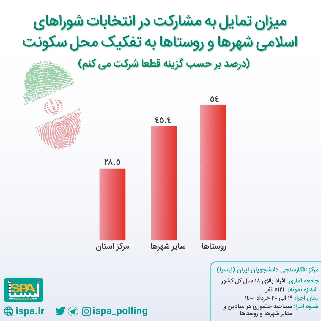 تمایل به مشارکت قطعی در انتخابات شوراهای اسلامی در مراکز استان‌ها ۲۸.۵ درصد، در سایر شهرها ۴۵.۴ درصد و در روستاها ۵۴ درصد است.