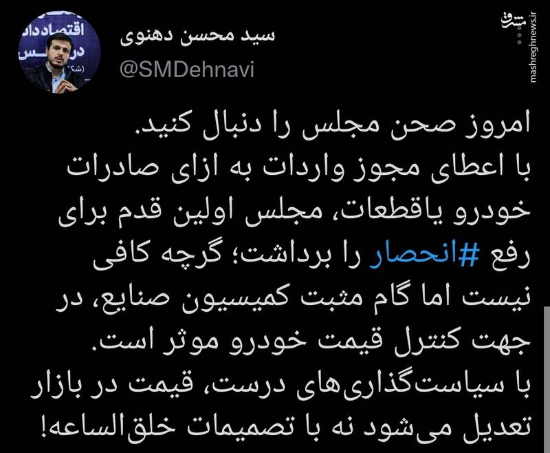 محسن دهنوی نوشت: ‏امروز صحن مجلس را دنبال کنید. با اعطای مجوز واردات به ازای صادرات خودرو یاقطعات، مجلس اولین قدم برای رفع انحصار را برداشت؛ گرچه کافی نیست اما گام مثبت کمیسیون صنایع، در جهت کنترل قیمت خودرو موثر است. با سیاست‌گذاری‌های درست، قیمت در بازار تعدیل می‌شود نه با تصمیمات خلق‌الساعه!