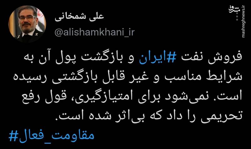 علی شمخانی طی توییتی نوشت: فروش نفت ایران و بازگشت پول آن به شرایط مناسب و غیر قابل بازگشتی رسیده است. نمیشود برای امتیازگیری، قول رفع تحریمی را داد که بیاثر شده است.