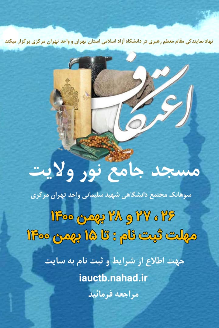 مراسم معنوی اعتکاف در ایامالبیض ماه مبارک رجب ۲۶ و۲۷ و۲۸ بهمن ماه در مسجد جامع نور ولایت مجتمع شهید حاج قاسم سلیمانی دانشگاه آزاد اسلامی واحد تهران مرکزی (سوهانک) برگزار میشود.
