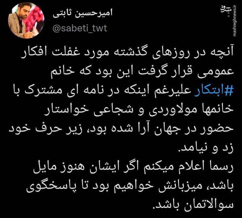 امیرحسین ثابتی، مجری برنامه جهان‌آرا در توییتر نوشت: ‏آنچه در روزهای گذشته مورد غفلت افکار عمومی قرار گرفت این بود که خانم ابتکار علیرغم اینکه در نامه ای مشترک با خانمها مولاوردی و شجاعی خواستار حضور در جهان آرا شده بود، زیر حرف خود زد و نیامد. رسما اعلام میکنم اگر ایشان هنوز مایل باشد، میزبانش خواهیم بود تا پاسخگوی سوالاتمان باشد.