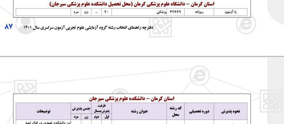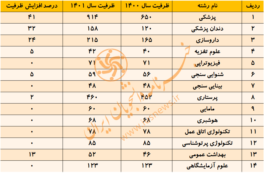 اما اگر نگاهی به دفترچه انتخاب رشته سال 1401 بیاندازیم این افزایش ظرفیت را در برخی از دانشگاه ها مشاهده میکنیم و در بعضی از دانشگاه ها شاهد این هستیم که برای اولین بار رشته پزشکی به آنها اضافه شده است. به طور مثال دانشکده های علوم پزشکی سیرجان و بهبهان نیز برای اولین بار قرار است دانشجوی پزشکی جذب کنند.