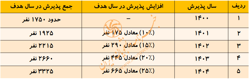 با استناد به بند 5-4 سیاستهای کلی علم و فناوری ابلاغی مورخ 1393/06/29 مقام معظم رهبری (مدظله) با موضوع تنظیم رابطه متقابل تحصیل با اشتغال و بند ۲-۵ سیاستهای کلی سلامت ابلاغی مورخ 1393/01/18 مقام معظم رهبری (مدظله) با موضوع ارتقا شاخصهای سلامت برای دستیابی به جایگاه اول در منطقه و همچنین بند ۱۳ این سیاستها با موضوع توسعه کیفی و کمی نظام آموزش علوم پزشکی و مستند به اقدام ملی ۱۴ از راهبرد کلان ۶ نقشه جامع علمی کشور در خصوص تنظیم ظرفیت دانشگاهها و درراستای اتخاذ تدابیر مناسب برای مواجهه با بحران پیری جمعیت در آینده؛ رفع کمبود پزشک؛ جلوگیری از فرسودگی کادر درمان و کاهش آسیبپذیری نظام سلامت در مواجهه با بحرانها؛ افزایش دسترسی اقشار مختلف مردم به پزشک و تنظیم ظرفیت دانشگاهها و دانشکدههای علوم پزشکی بر اساس نیاز جامعه، با توجه به سرانه پزشک به جمعیت ۱۳ در ده هزار در سال جاری و به منظور دستیابی به سرانه پزشک به جمعیت ۲۰ در ده هزار در سال 1401، وزارت بهداشت، درمان و آموزش پزشکی موظف است بهگونهای برنامهریزی نماید که ظرفیت پذیرش دانشگاهها و مؤسسات آموزش عالیِ تحت نظارت آن وزارت برای رشته پزشکی در مقطع عمومی، از سال ۱۴۰۱ به مدت حداقل چهار سال، در هر سال ۲۰ درصد نسبت به سال قبل به شرح جدول ذیل افزایش یابد.