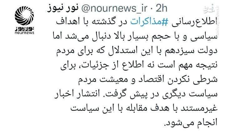 حساب توییتری نورنیوز رسانه شورای ‌عالی امنیت‌ ملی نوشت: سیاست اطلاع‌رسانی تیم مذاکره جدید «شرطی نکردن اقتصاد و معیشت مردم» بوده و « انتشار اخبار غیر مستند» درباره مذاکرات با هدف مقابله با این سیاست انجام می‌شود. نورنیوز تاکید کرد: برای مردم نتیجه مذاکرات مهم است نه اطلاع از جزئیات