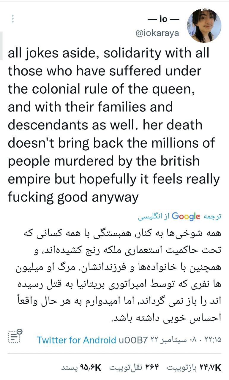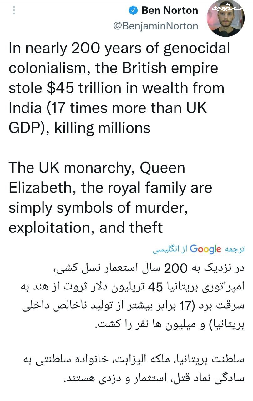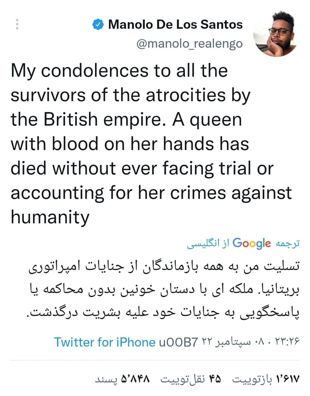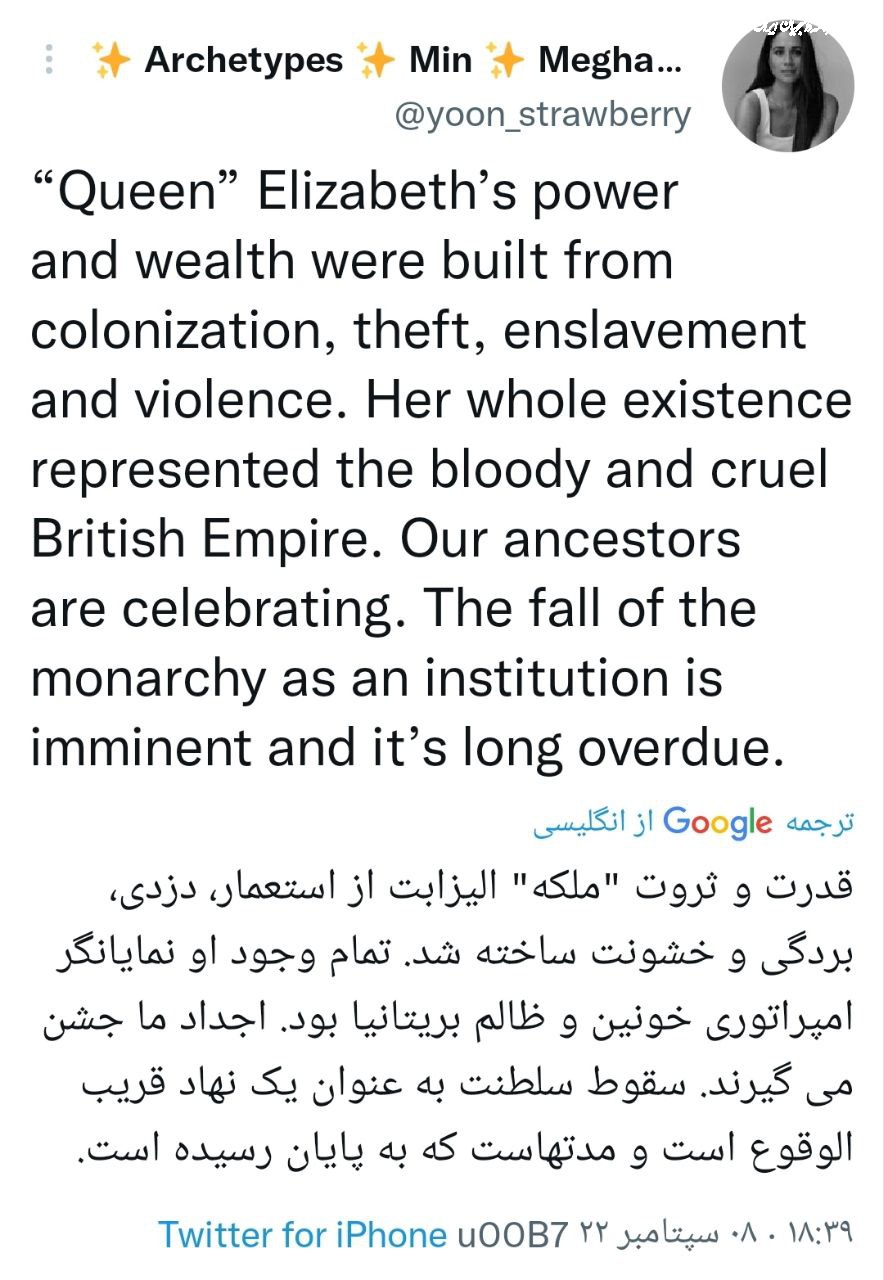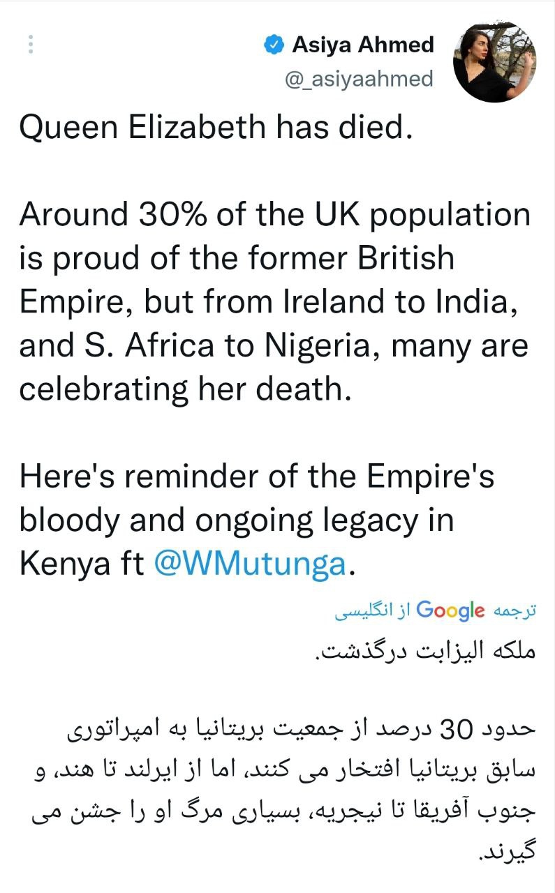 در ادامه واکنش توئیتری برخی روزنامه‌نگاران و صاحب‌نظران کشورهای مختلف درباره مرگ ملکه الیزابت دوم انگلیس را مشاهده می کنید.