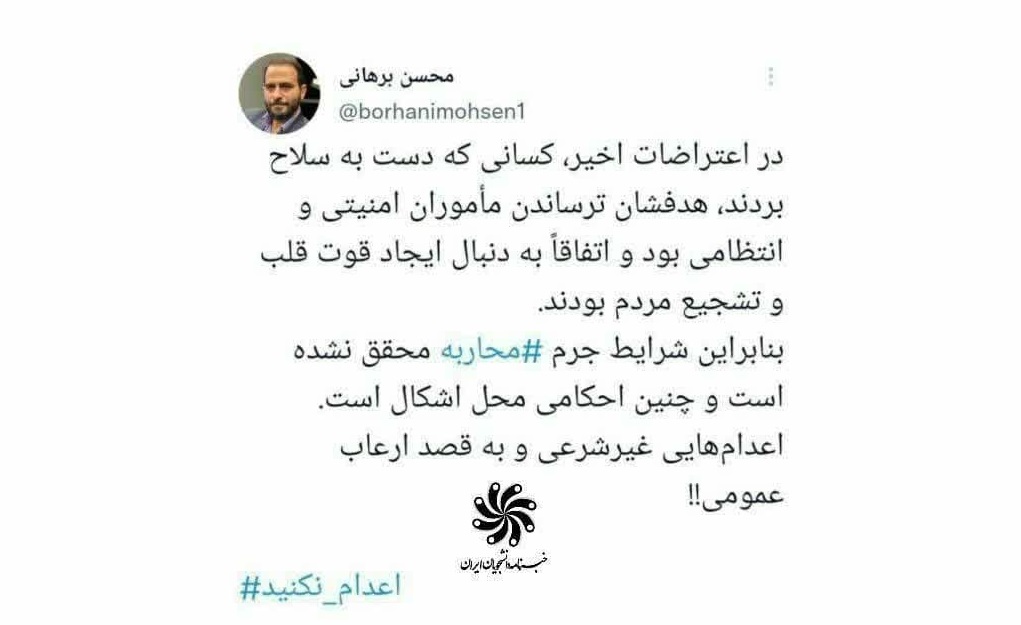 برای مثال محسن برهانی استاد حقوق دانشگاه تهران در توییتی اقدامات تروریستی، خشونتآمیز و مسلحانه را عامل قوت قلب عنوان کرد و در توئیت خود نوشت: در اعتراضات اخیر، کسانی که دست به سلاح بردند، هدفشان ترساندن ماموران امنیتی و انتظامی بود و اتفاقا به دنبال ایجاد قوت قلب و تشجی مردم بودند.