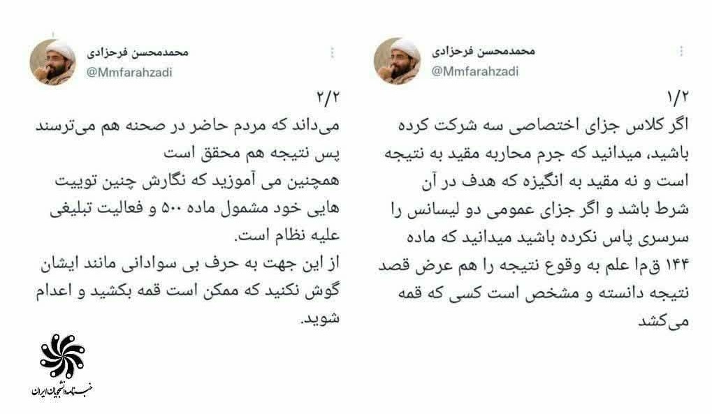محمد حسین فرحزادی یکی از حقوقدانان نیز در جوابی به این استاد دانشگاه که اقدامات تروریسی را محاربه نمی دانست نوشت: اگر کلاس جزای اختصاصی سه شرکت کرده باشید، میدانید که جرم محاربه مقید به نتیجه است و نه مقید به انگیزه که هدف در آن شرط باشد و اگر جزای عمومی دو لیسانس را سرسری پاس نکرده باشید می دانید که ماده ۱۴۴ قما علم به وقوع نتیجه را هم عرض قصد نتیجه دانسته و مشخص است کسی که قمه میکشد میداند که مردم حاضر در صحنه هم میترسند پس نتیجه هم محقق است.