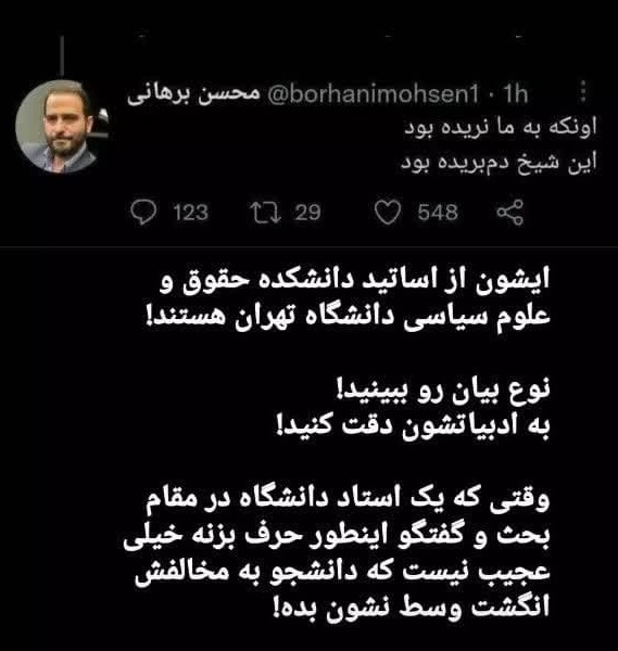 این استاد دانشگاه تهران در توئیتی دیگر از الفاظی استفاده کرده است که در کوچه و خیابان جوانان و نوجوانان ما که معمولا در جمع های دوستانه و خصوصی خود از این الفاظ استفاده می کنند هنوز به احترام بزرگان جمع به خود اجازه چنین رفتاری را در حضور ریش سفیدی نمی دهند اما این استاد دانشگاه در فضای عمومی و مجازی چنین الفاظی را به کار می برد.