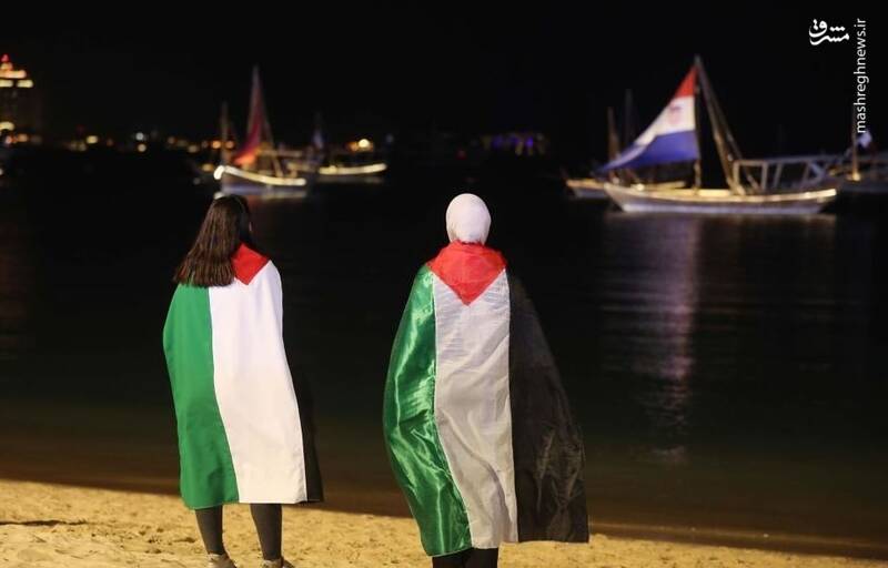 در حاشیه جام جهانی ۲۰۲۲ قطر مردم با پرچم های فلسطین در ساحل کاتارا دیده میشوند.