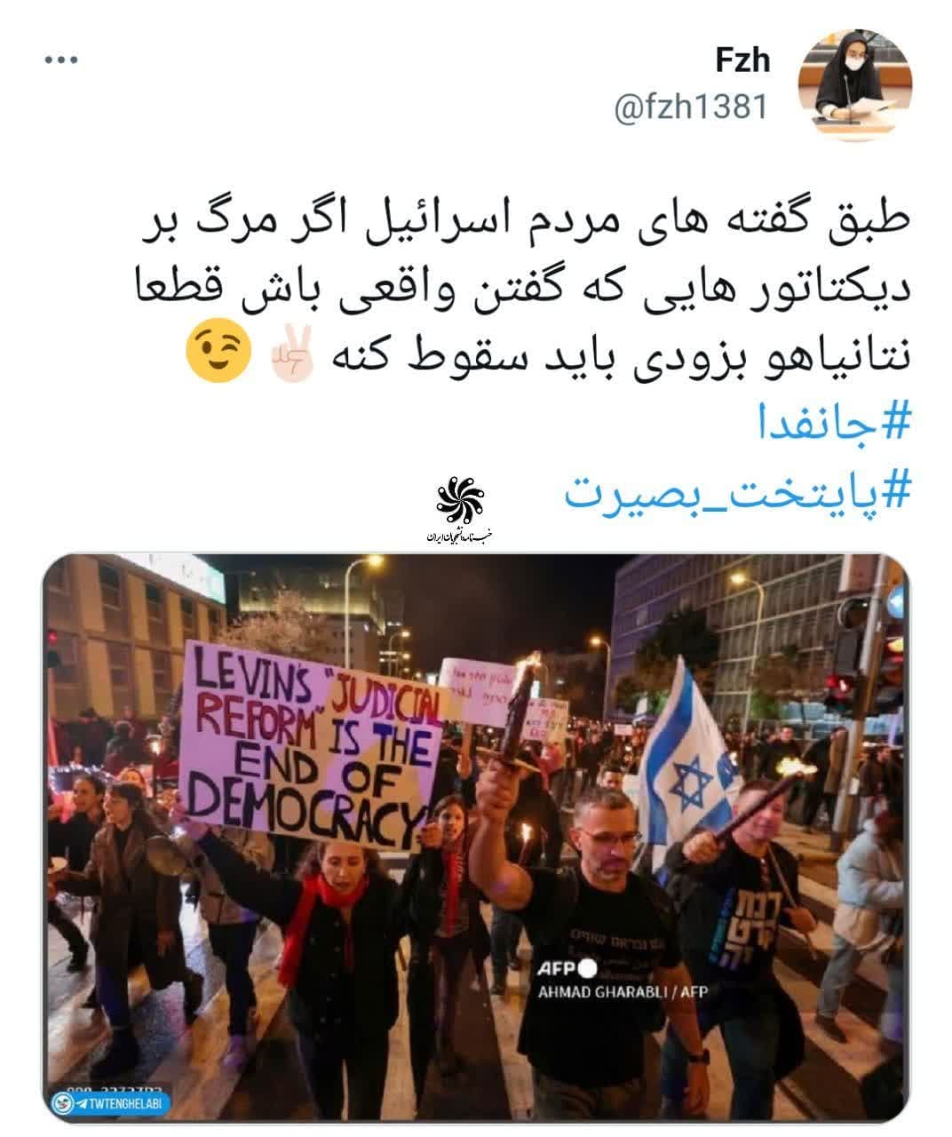 این روزها هزاران اسرائیلی در مخالفت با سیاست های دولت ائتلافی به رهبری نتانیاهو در مرکز تل آویو در میدان هابیما تظاهرات کردند. برخی منابع از جمله رادیوی ارتش رژیم موقت صهیونیستی از ۱۰۰ هزار تظاهرکننده یاد کردهاند که مخالفت خود را با کابینه افراطی نتانیاهو و طرح یاریو لوین، وزیر دادگستری این رژیم اعلام کردند.