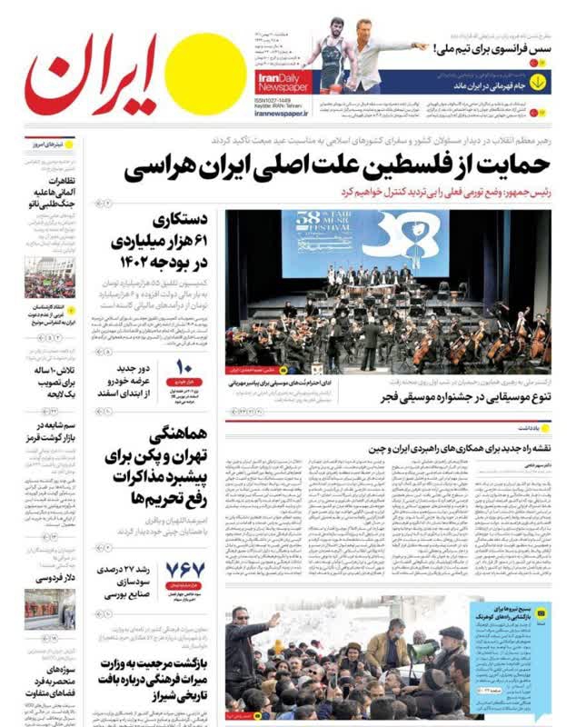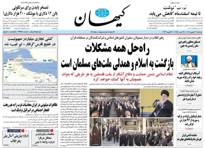 قول کاهش تورم به مردم و رهبری، فلسطین را رها نمی‌کنیم، راه حل مشکلات بازگشت به اسلام است، دفاع از فلسطین بدون ملاحظه، تیتر برخی روزنامه‌های یکشنبه ۳۰ بهمن ماه ۱۴۰۱ است.