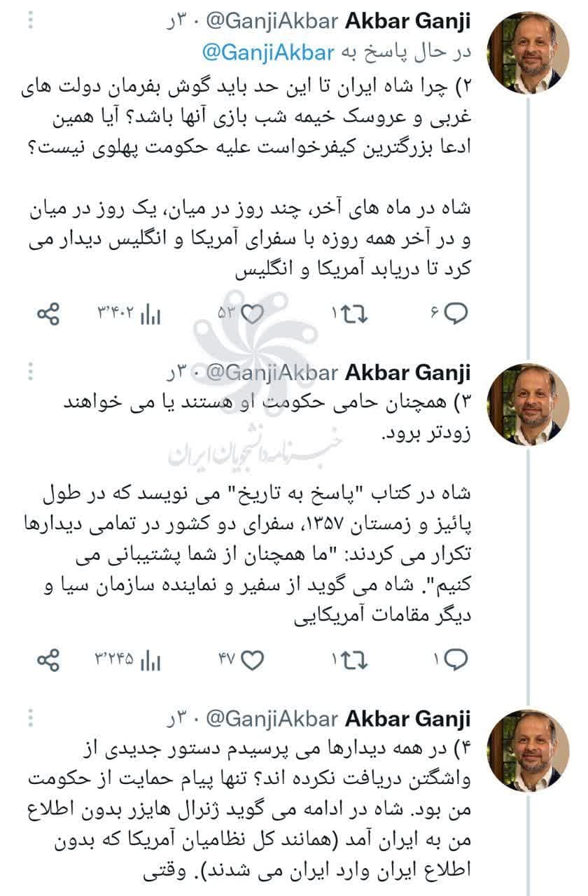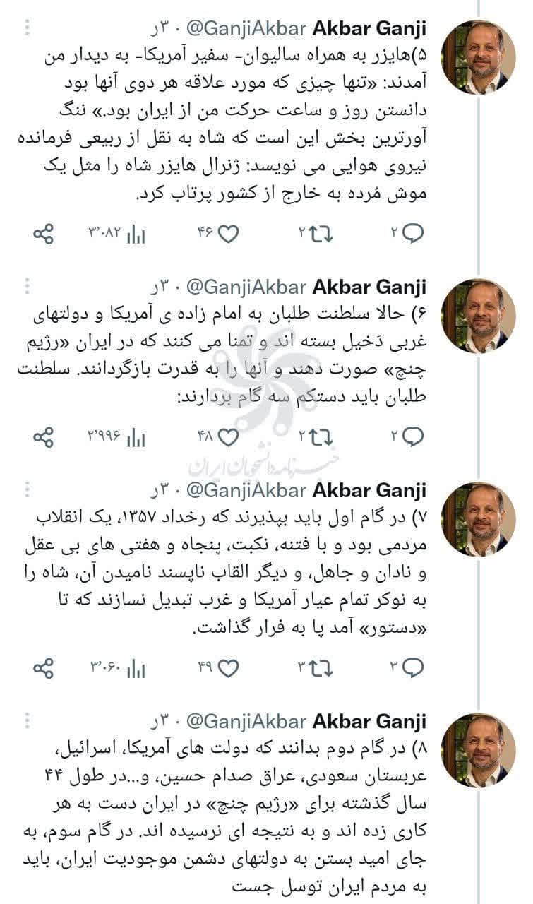 گنجی در ادامه گنجی دست رهبران اپوزیسیون خارجی را نیز برملا می کند و آن ها را محکوم به حقوق های کلان از دولت های غربی و سازمان سیا آمریکا می کند. از این رو در ادامه این رشته توئیت اکبر گنجی، اپوزیسیون خارج نشین را می خوانید: