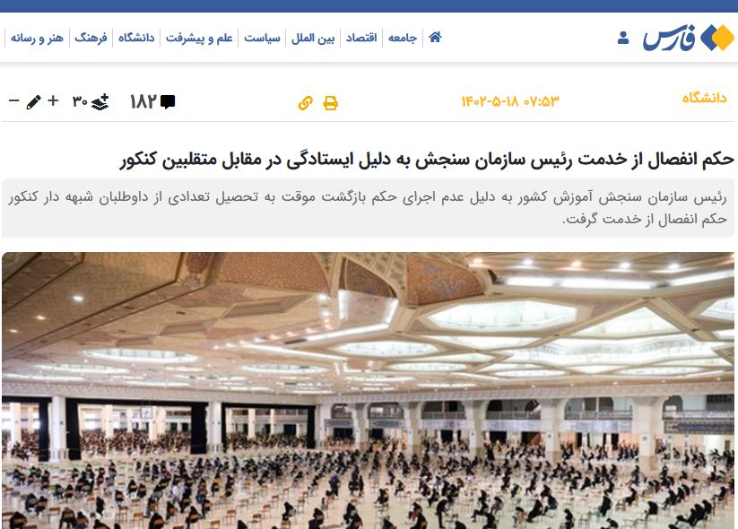 دیوان عدالت اداری تاکید کرده ادعای برخی رسانه‌ها مبنی بر اینکه دیوان عدالت اداری حکم انفصال از خدمت رئیس سازمان سنجش را به‌دلیل عدم اجرای حکم بازگشت موقت به تحصیل تعدادی از داوطلبان شبهه‌دار کنکور صادر کرده، صحت ندارد و تاکنون در مورد پرونده مورد اشاره رایی در دیوان عدالت اداری صادر نشده است.