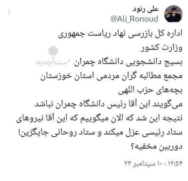 طی چند روز گذشته و در حالی که همه درحال بهره برداری و استفاده از ایام اربعین بودند، به شکل شبانه دکتر شاکریان معاون مالی و اداری دانشگاه شهید چمران اهواز که جزو خانواده شاهد و ایثارگر و بیش از ۷سال سابقه ریاست بسیج اساتید خوزستان و ستاد انتخاباتی آیت الله رییسی را برعهده داشته، برکنار و فردی که از اعضای فعال ستاد روحانی است جایگزین کرد.