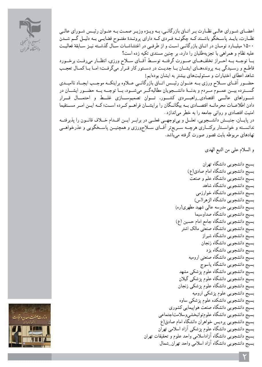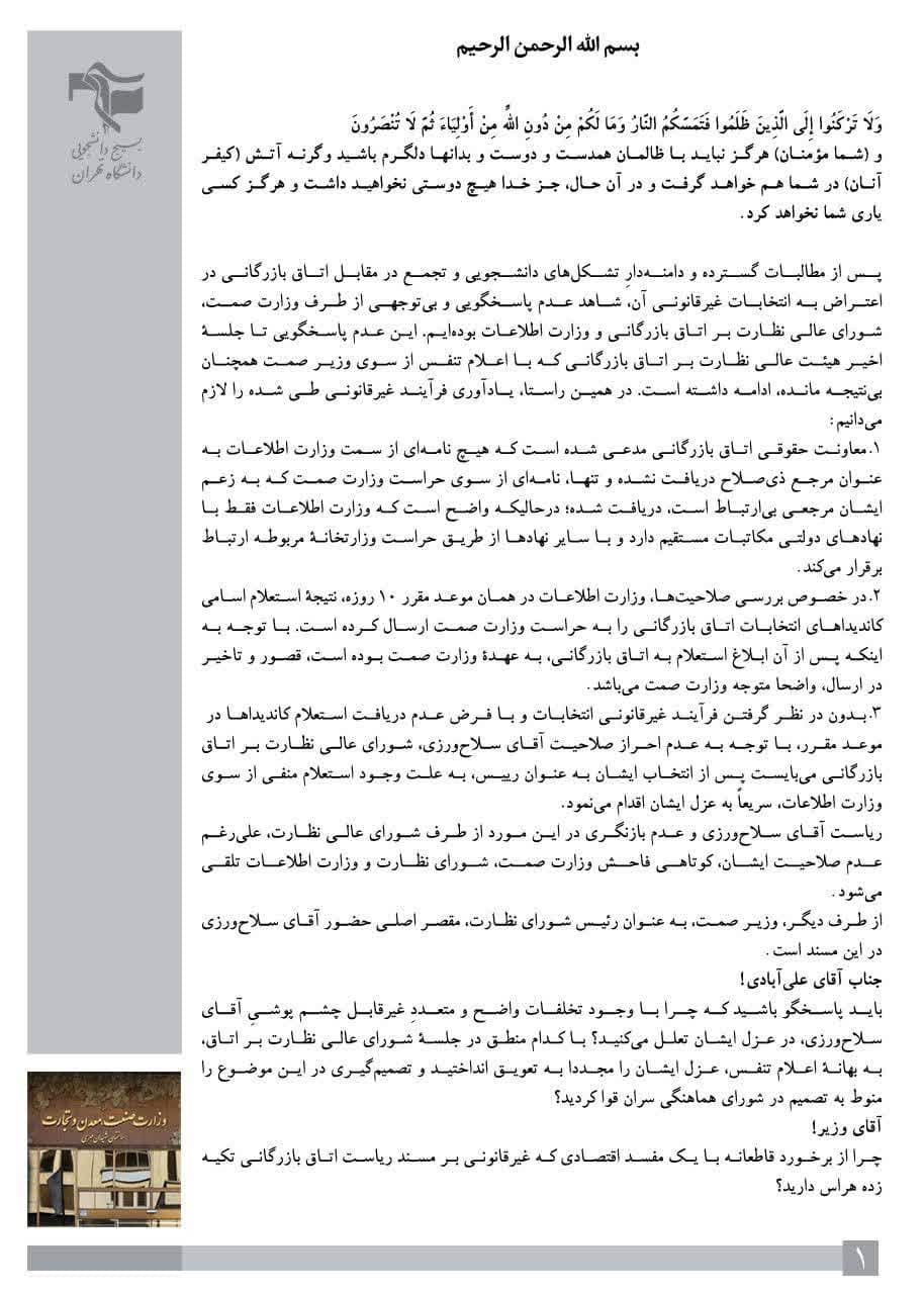 در پایان، جنبش دانشجویی، تعلل و بیتوجهی فعلی در برابر این اقدامِ خلاف قانون را پذیرفته ندانسته و خواستار برکناری هرچه سریعتر آقای سلاحورزی و پاسخگویی و عذرخواهی نهادهای مربوطه بابت قصور صورت گرفته میباشد.