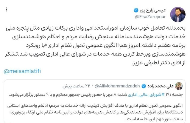 در همین راستا، عیسی زارع پور، وزیر ارتباطات و فناوری اطلاعات امروز در پاسخ به محمدزاده با بازنشر این ویراست، نوشته است: بحمدلله تعامل خوب سازمان اموراستخدامی و اداری برکات زیادی مثل پنجره ملی خدمات دولت هوشمند، سامانه سنجش رضایت مردم و احکام هوشمندسازی برنامه هفتم داشته است. امروز هم «الگوی عمومی تحول نظام اداری» با رویکرد هوشمندسازی و برخط کردن همه خدمات در شورای عالی اداری تصویب شد.»