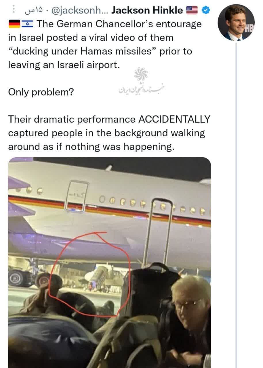 توئیت خبرنگار آمریکایی اقدامات صهیونیست‌ها و صدراعظم آلمان را افشا کرد: درحالی که صهیونیست‌ها و آلمان ها هنگام خروج صدراعظم را می‌خواستند را زیر موشک‌ها حماس نشان دهند و یک صحنه دراماتیک و چهره قهرمان از وی بسازند اما رفتار بقیه افراد حاضر در فرودگاه نشان می‌دهد که هیچ اتفاقی در حال رخ دادن نیست و رفتار عادی خود را نشان می‌دهند.