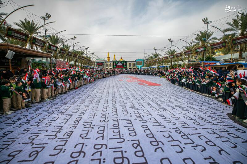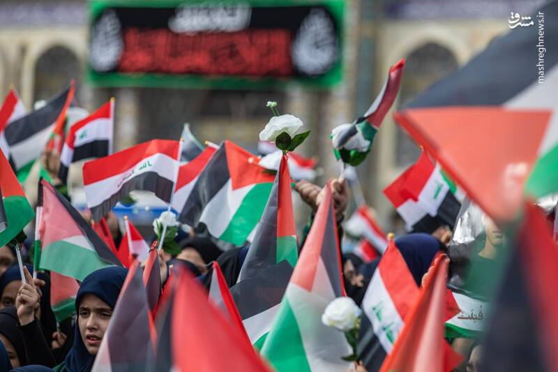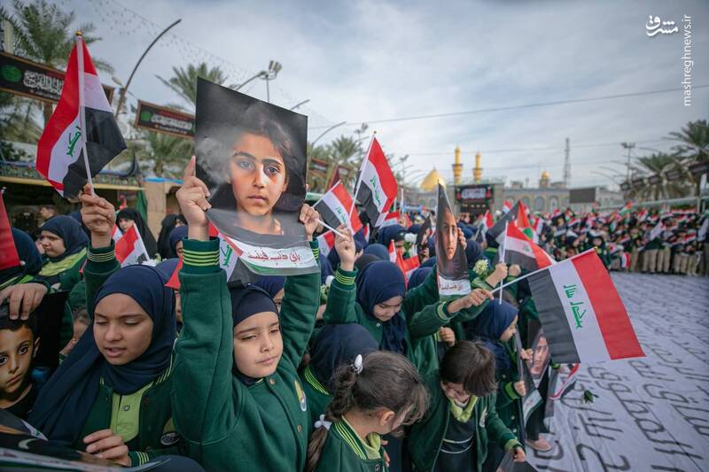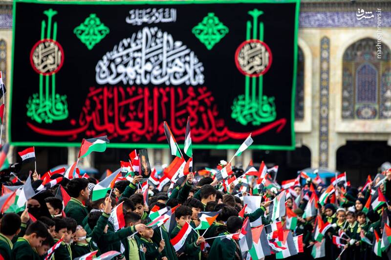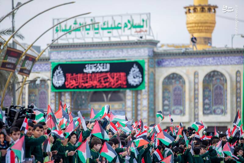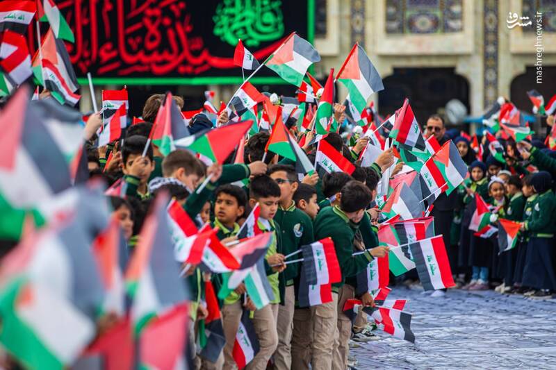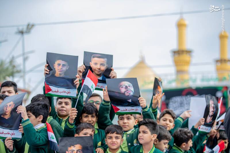 تعداد زیادی از دانشآموزان عراقی ساکن کربلا در حمایت از کودکان فلسطینی در خیابان بینالحرمین تجمع کردند.