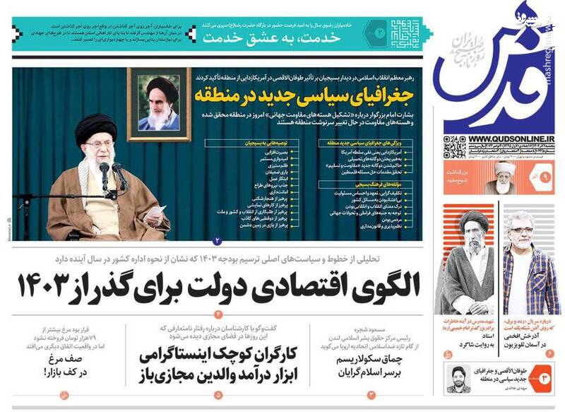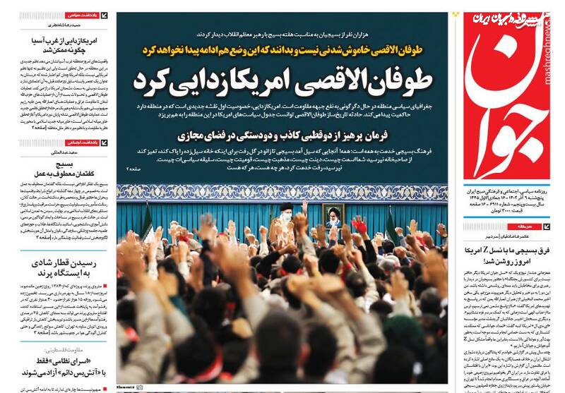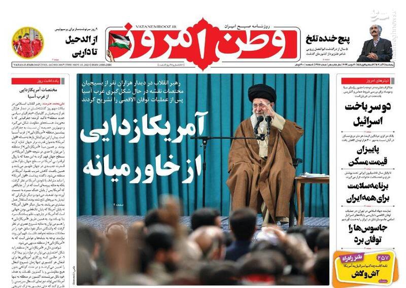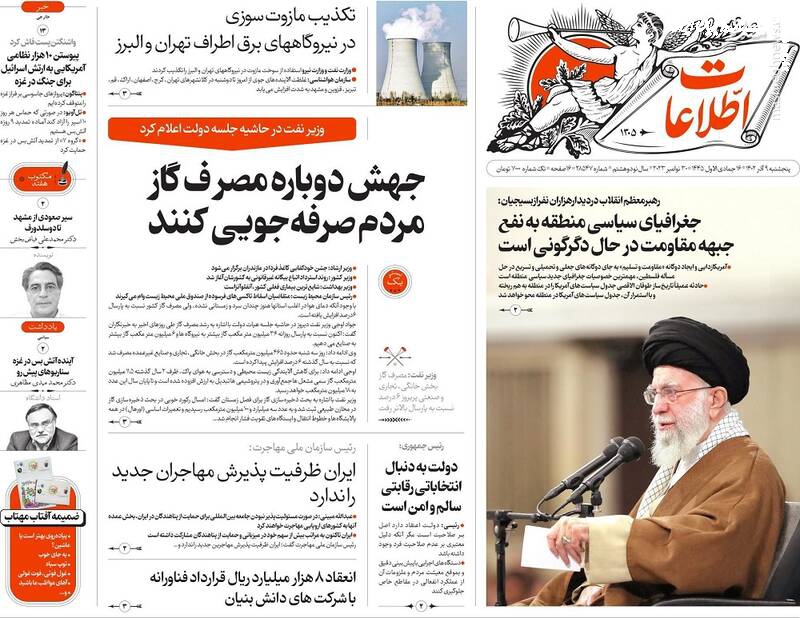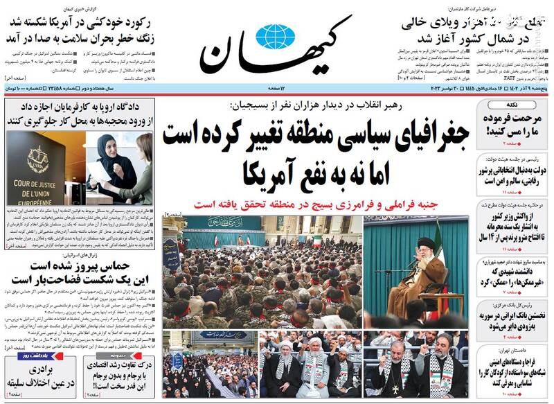 دستور عقبنشینی در اردوگاه غرب، جغرافیای سیاسی منطقه تغییر کرده است اما نه به نفع آمریکا، مرامنامه مدرسه عشق، طوفان الاقصی امریکازدایی کرد، تیتر برخی روزنامههای پنجشنبه ۹ آذر ۱۴۰۲ است.