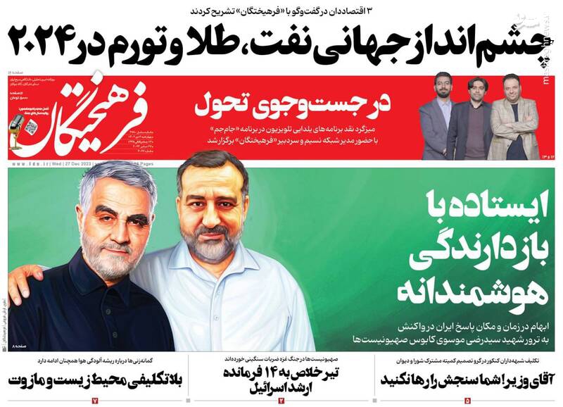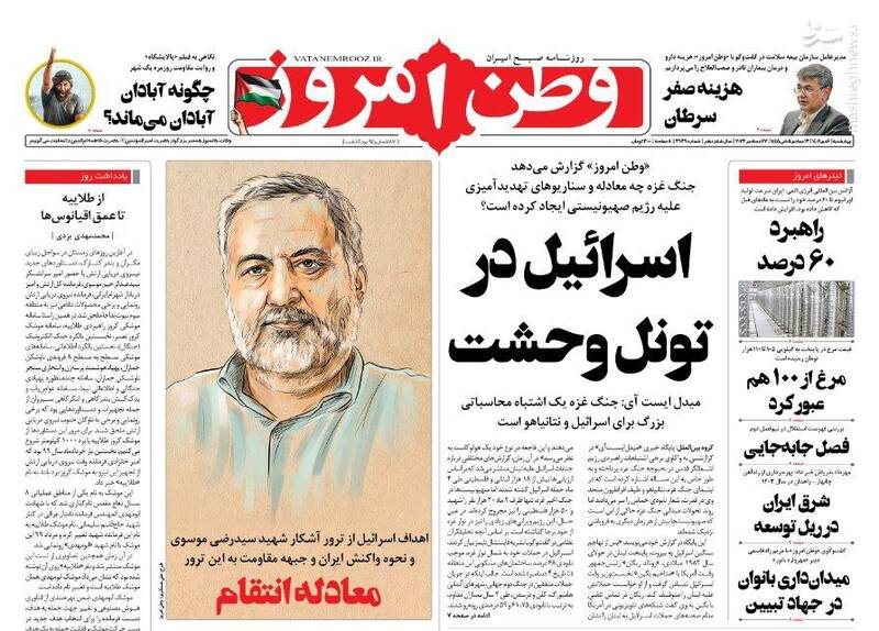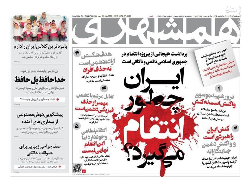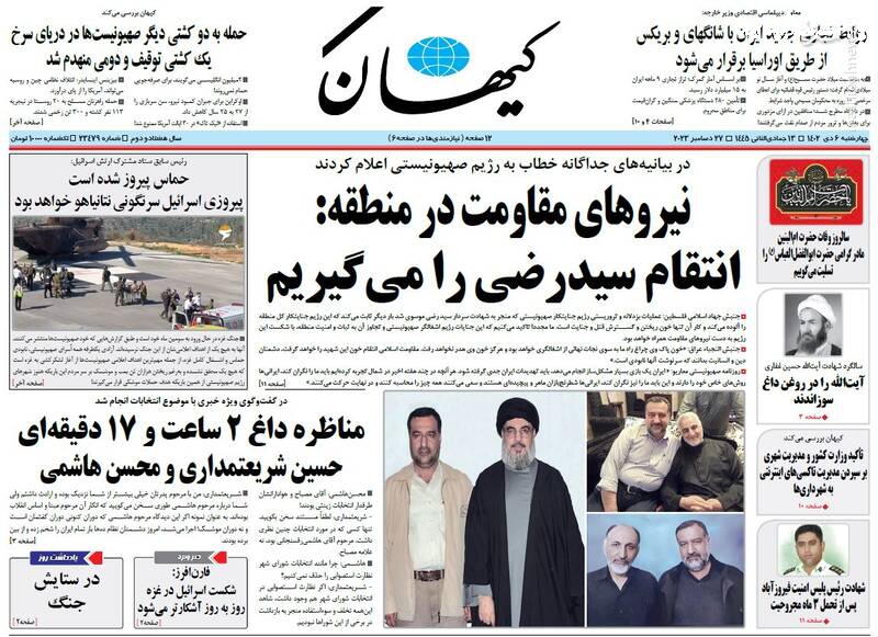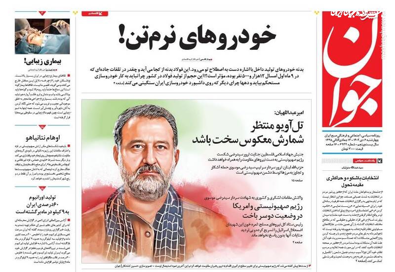 ایستاده با بازدارندگی هوشمندانه، نیروهای مقاومت در منطقه: انتقام سیدرضی را میگیریم، خودروهای نرمتن!، راه سخت جوانی جمعیت، تیتر برخی روزنامههای چهارشنبه ششم دی ماه است.