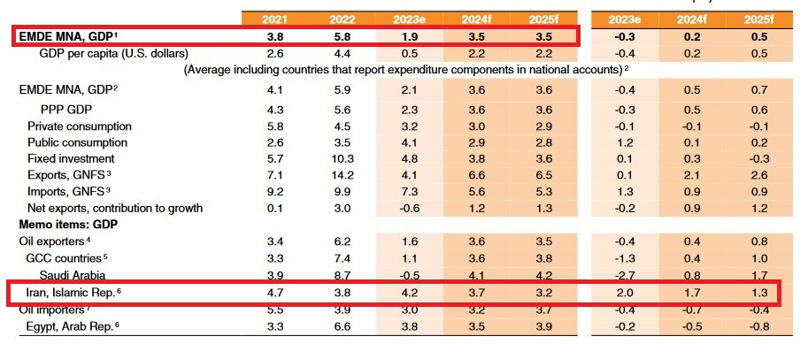 رشد اقتصادی کشورهای خاورمیانه و شمال آفریقا (منطقه منا) از ۵.۸ درصد در سال ۲۰۲۲ به ۱.۹ درصد در سال ۲۰۲۳ کاهش یافته است که رشد اقتصادی ایران در سال ۲۰۲۳ بیش از ۲ برابر رشد اقتصادی این منطقه است.