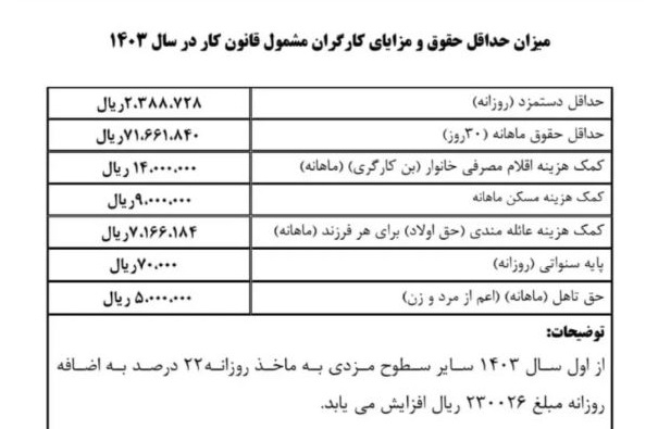 در سال 1403، حقوق و دستمزد کارمندان دولت و کارگران مشمول قانون کار با یک افزایش 35 درصد مواجه خواهد شد. بر اساس جدول حقوق کارگران 1403 تامین اجتماعی ارائه شده، حداقل دستمزد ساعتی برای کارگران و کارمندان به مبلغ 325.884 ریال خواهد بود. همچنین، حداقل دستمزد روزانه در این سال 728,388,2 ریال و حداقل حقوق ماهانه 71.661.840 تومان خواهد بود. این افزایش حقوق و دستمزد به عنوان یکی از روشهای تنظیم نرخ حقوق در جهت کنترل تورم و تعادل بازار کار انجام میشود.