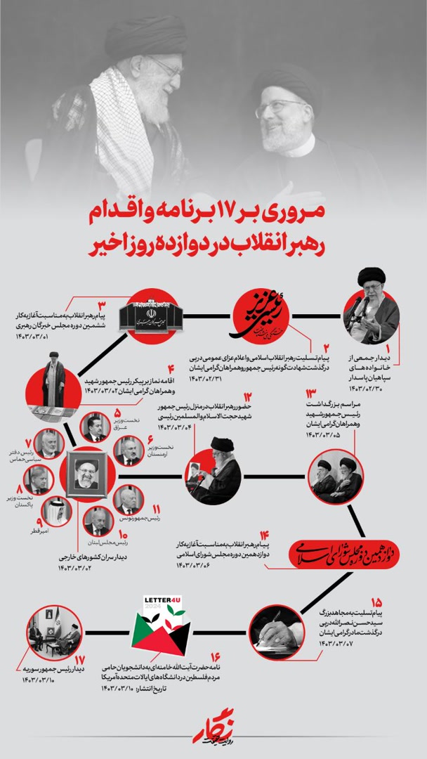 به گزارش «خبرنامه دانشجویان ایران»؛حضرت آیتالله خامنهای رهبر انقلاب در ۱۲روز اخیر با تدابیر خود ۱۷ برنامه و اقدام راهبردی را اجرا کردهاند.