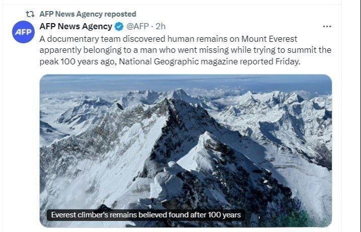 به گزارش «خبرنامه دانشجویان ایران»؛ گمان میرود بقایای جسد کوهنورد اندرو اروین که ۱۰۰ سال پیش هنگام تلاش برای صعود به بلندترین کوه جهان جان باخت، در اورست پیدا شده باشد.