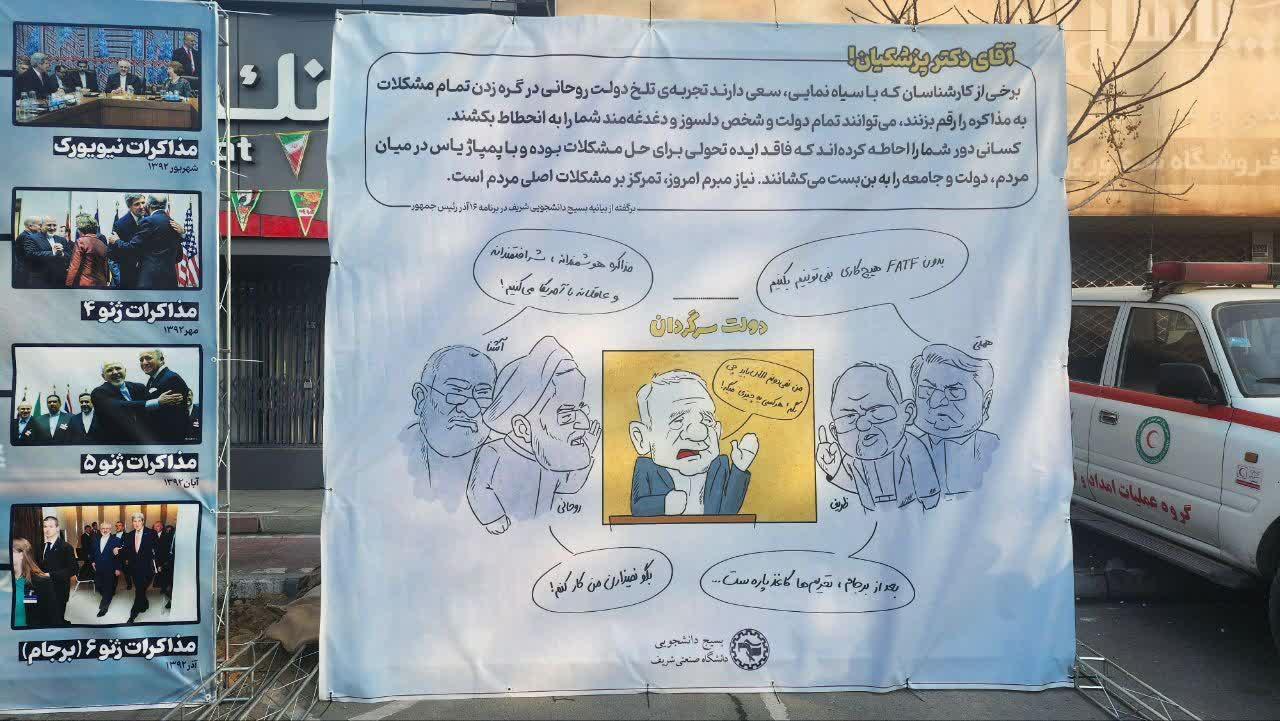 با فشارهای بیرونی، بنر انتقادی بسیج دانشجویی دانشگاه صنعتی شریف، توسط افرادی خاص، پایین کشیده شد.
