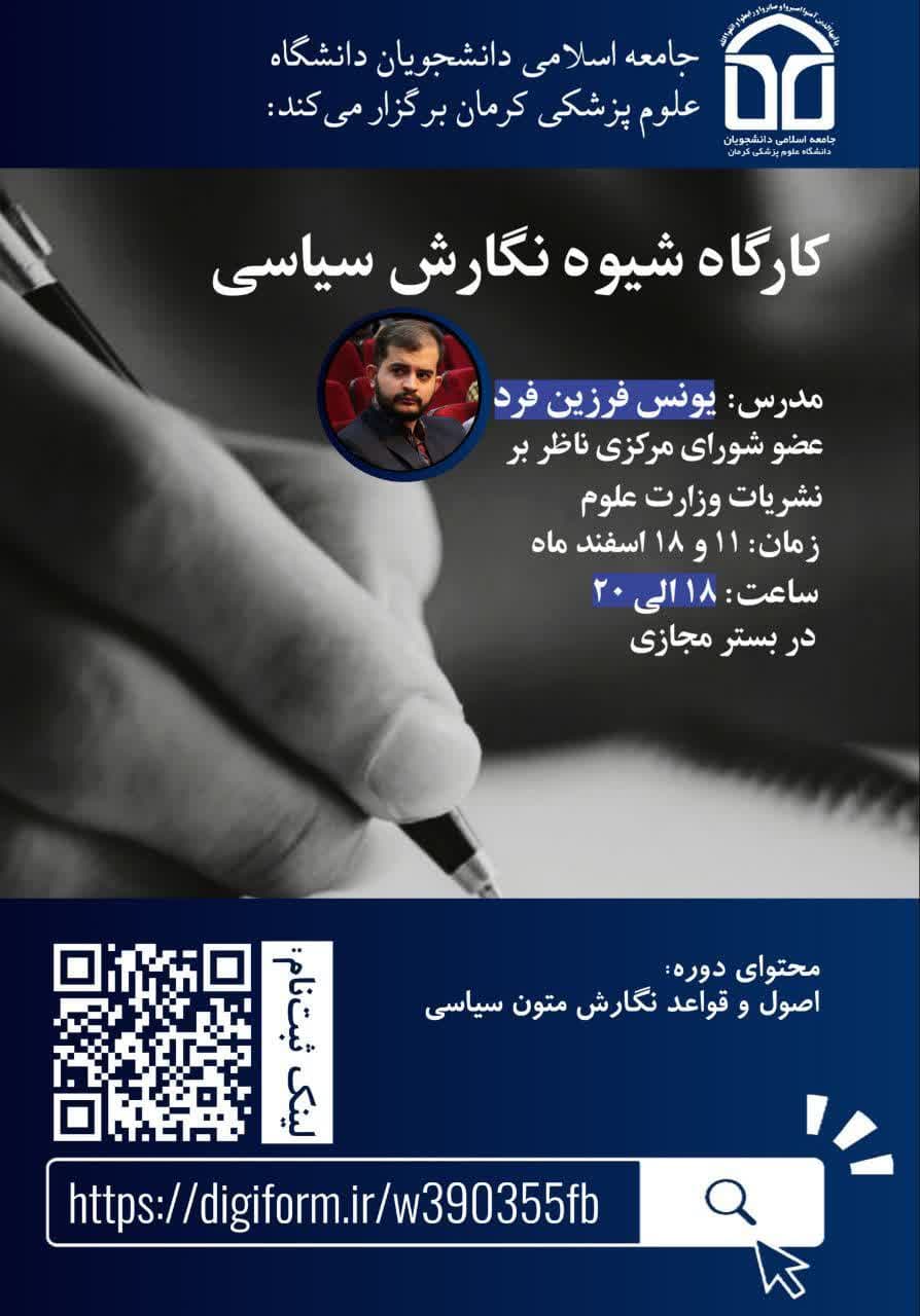 به گزارش «خبرنامه دانشجویان ایران»؛ به همت جامعه اسلامی دانشجویان دانشگاه علوم پزشکی کرمان کارگاه شیوه نگارش سیاسی ویژه فعالین نشریات دانشجویی با تدریس یونس فرزین فرد عضو شورای مرکزی ناظر بر نشریات وزارت عتف روز شنبه ۱۱ و ۱۸ اسفند ماه ۱۴۰۳ در بستر فضای مجازی برگزار میگردد.