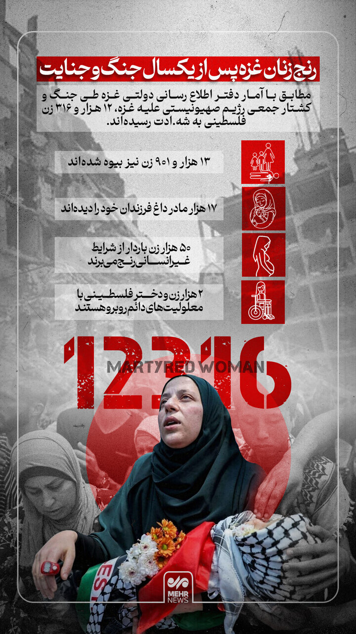 مطابق با آمار دفتر اطلاع رسانی دولت غزه طی جنگ کشتار جمعی رژیم صهیونیستی علیه غزه؛۱۲ هزار و ۳۱۶ زن فلسطینی به شهادت رسیدند.