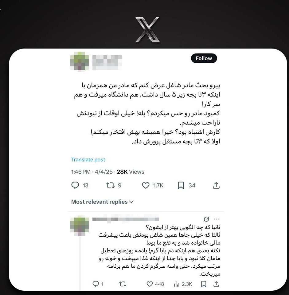 به گزارش «خبرنامه دانشجویان ایران»، توی چند روز گذشته در فضای مجازی، بحث مادران شاغل و خانهدار حسابی داغ شده؛ با خاطراتی که بچهها از قدیما گفتن و الان داره مرور میشه. بعضیها از تنهایی تو خونه نوشتن؛ از درهایی که خودشون بیصدا باز میکردن، از خونهای که بوی غذای گرم نمیداد. یه عده دیگه هم گفتن مادر شاغلشون یه زن مستقل و پر انرژی بوده و همین براشون شده یه الگوی درستحسابی تو زندگی.