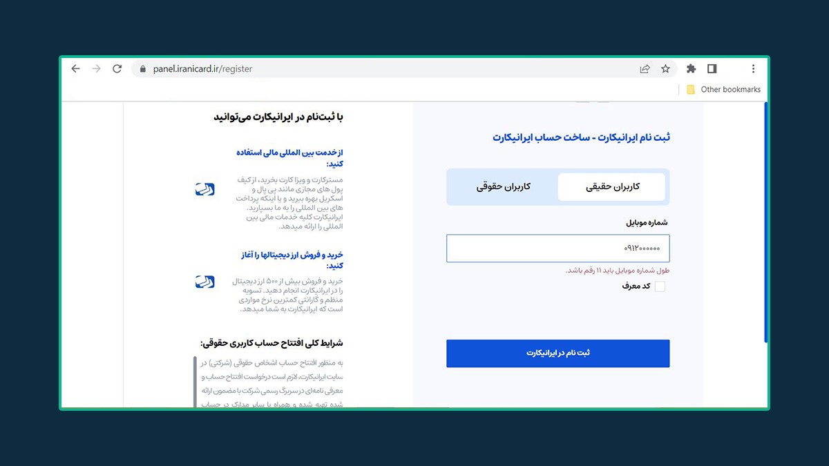 ابتدا به سایت رسمی صرافی ایرانیکارت مراجعه کنید. مطمئن شوید که آدرس درست را وارد کردهاید تا از امنیت اطلاعات خود مطمئن باشید.