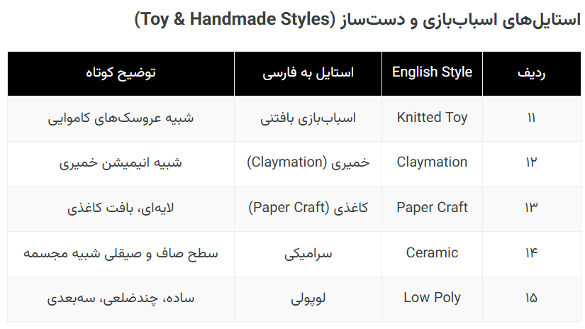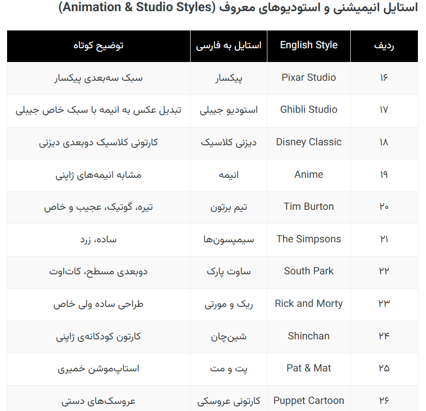 در ادامه به برخی از پرطرفدارترین استایلهای شناختهشده برای ساخت تصاویر دوبعدی و اکشن فیگور اشاره شده است. این استایلها را باید در پرامپتها در بخش مربوطه جایگزین کنید.