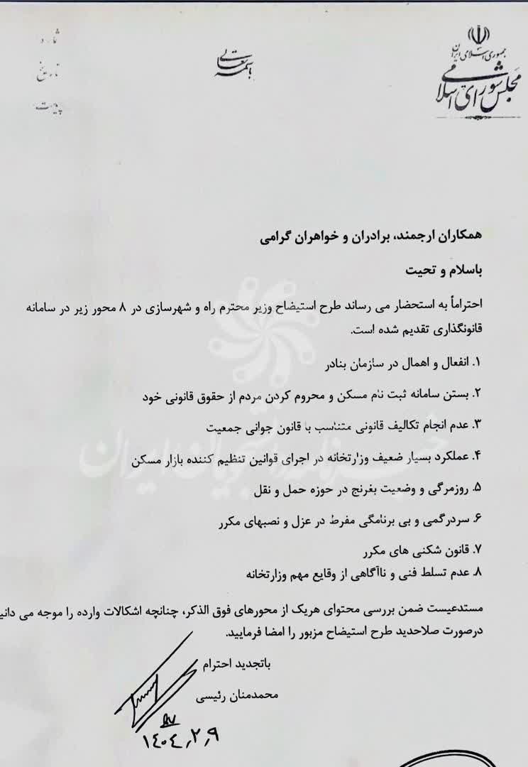 طرح استیضاح وزیر راه و شهرسازی با هشت محور انتقادی از جمله ضعف در مدیریت مسکن، نابسامانی در حمل‌ونقل و بی‌ثباتی در انتصابات، در سامانه قانون‌گذاری مجلس به ثبت رسید.