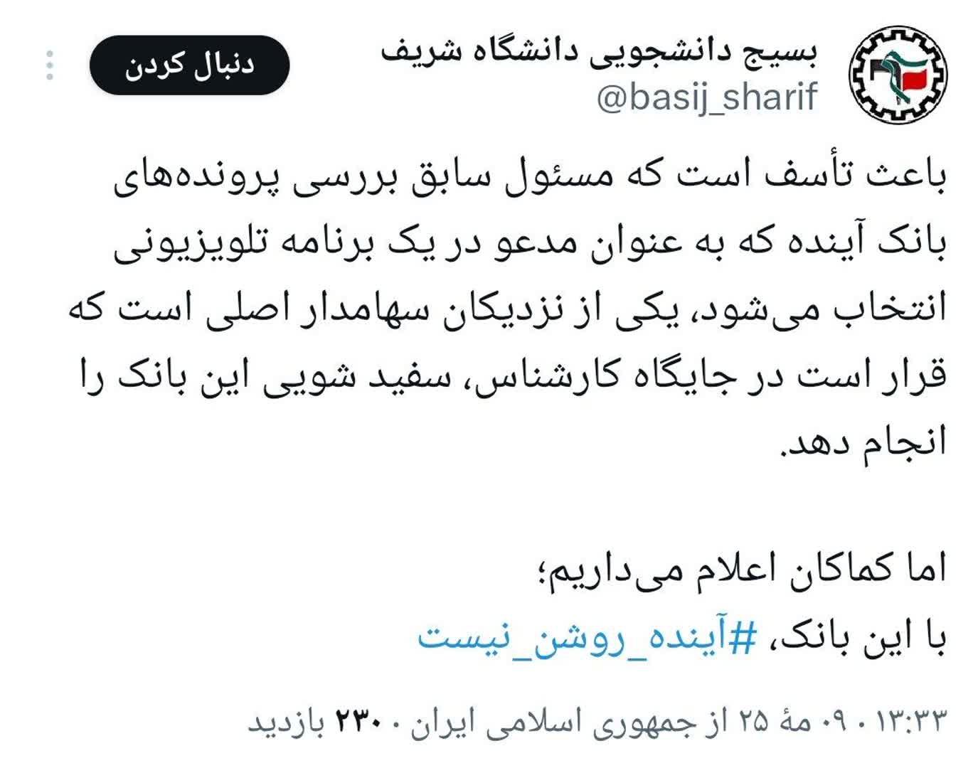 باعث تأسف است که مسئول سابق بررسی پروندههای بانک آینده که به عنوان مدعو در یک برنامه تلویزیونی انتخاب میشود، یکی از نزدیکان سهامدار اصلی است که قرار است در جایگاه کارشناس، سفید شویی این بانک را انجام دهد.