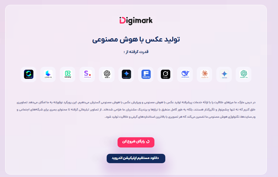 این تنوع، دیجی مارک را به یک «برنامه ساخت عکس با هوش مصنوعی» همهکاره تبدیل کرده است که میتواند نیازهای گوناگون کاربران، از طراحان گرافیک و تولیدکنندگان محتوا گرفته تا مدیران بازاریابی و حتی کاربران عادی را برآورده سازد.