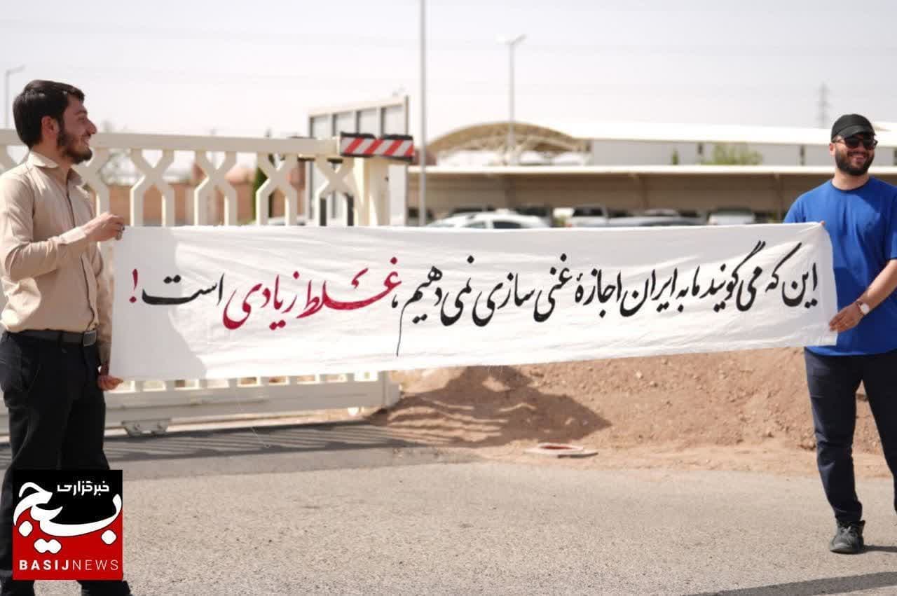دانشجویان در ادامه با در دست داشتن پرچم های جمهوری اسلامی ایران و شعارهای دست نویسی مقابل تأسیسات هستهای فردو زنجیره انسانی تشکیل دادند.