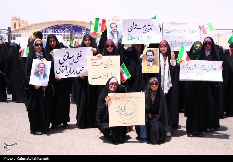 شرکتکنندگان حاضر در این زنجیره انسانی مقابل سایت غنیسازی شهید مصطفی احمدی روشن تصاویری از شهدای هستهای از جمله شهیدان علی محمدی، شهریاری، رضایینژاد و احمدیروشن را در دست داشتند.