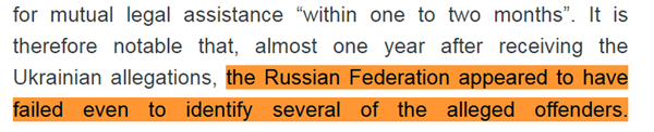 دادگاه نیز بر اساس همین مبنا، عملکرد روسیه در پاسخ به یادداشتهای رسمی دولت اوکراین را ناکافی دانست، بهویژه با توجه به اینکه روسیه تقریباً یک سال پس از دریافت اطلاعات اولیه، حتی موفق به شناسایی برخی از افراد مظنون نیز نشده بود.