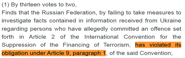 افزون بر این، دیوان تأکید کرد که طبق بند ۶ ماده ۹ کنوانسیون، روسیه موظف بود ضمن انجام تحقیقات معنادار، نتایج آن را بهصورت شفاف و فوری در اختیار دولت اوکراین قرار دهد و در صورت وجود مشکلات در شناسایی مظنونان یا نیاز به اطلاعات تکمیلی، از طریق مکاتبه و مذاکره رسمی، درخواست اطلاعات بیشتر کند. با این حال، روسیه نهتنها از ارائه چنین همکاریای امتناع کرد، بلکه هیچ سازوکاری را نیز برای احراز اطلاعات یا رد ادعاهای اوکراین فعال نکرد. بنابراین دیوان در رأی نهایی خود، با اکثریت آراء (۱۳ رأی موافق در برابر ۲ رأی مخالف) رای خود را علیه روسیه صادر نمود که ترجمهی آن به این صورت است: «دادگاه دریافته است که فدراسیون روسیه با انجام ندادن اقدامات لازم برای تحقیق در مورد حقایق مندرج در اطلاعات دریافتی از اوکراین در مورد افرادی که ادعا میشود، مرتکب جرم مقرر در ماده ۲ کنوانسیون بینالمللی برای سرکوب تامین مالی تروریسم (CFT) شدهاست، تعهد خود را طبق بند ۱ ماده ۹ کنوانسیون مذکور نقض کرده است».