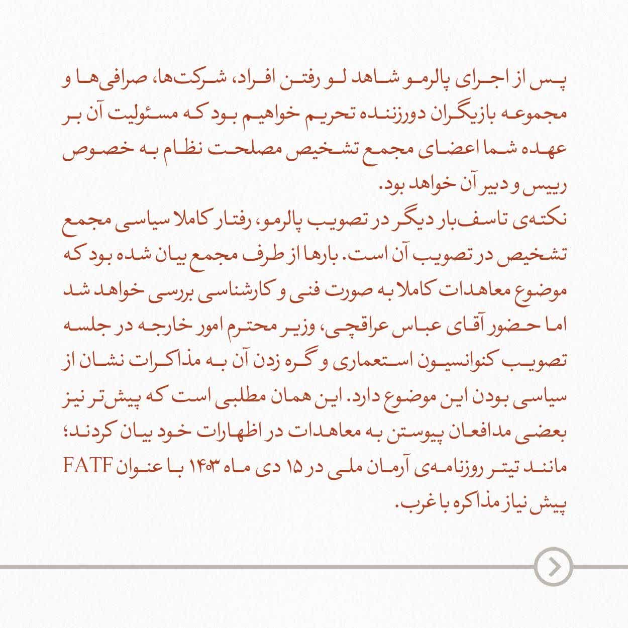 نکتهی تاسفبار دیگر در تصویب پالرمو، رفتار کاملا سیاسی مجمع تشخیص در تصویب آن است. بارها از طرف مجمع بیان شده بود که موضوع معاهدات کاملا به صورت فنی و کارشناسی بررسی خواهد شد، اما حضور آقای عباس عراقچی، وزیر محترم امور خارجه در جلسه تصویب کنوانسیون استعماری و گره زدن آن به مذاکرات نشان از سیاسی بودن این موضوع دارد. این همان مطلبی است که پیشتر نیز بعضی مدافعان پیوستن به معاهدات در اظهارات خود بیان کردند؛ مانند تیتر روزنامهی آرمان ملی در ۱۵ دی ماه ۱۴۰۳ با عنوان FATF پیش نیاز مذاکره با غرب. جالب است که پیش از این رییس مجمع حتی ارتباط کنوانسیونها با FATF را نیز انکار میکرد، اما در عمل نه تنها برای FATF بلکه برای خوشآمد ترامپ در مذاکرات، کنوانسیون استعماری را تصویب کرد. در واقع امتیازی بود که در میانه مذاکرات و پیش از تعیین تکلیف بسیاری از موضوعات مورد مذاکره، تقدیم طرف مقابل گردید.
