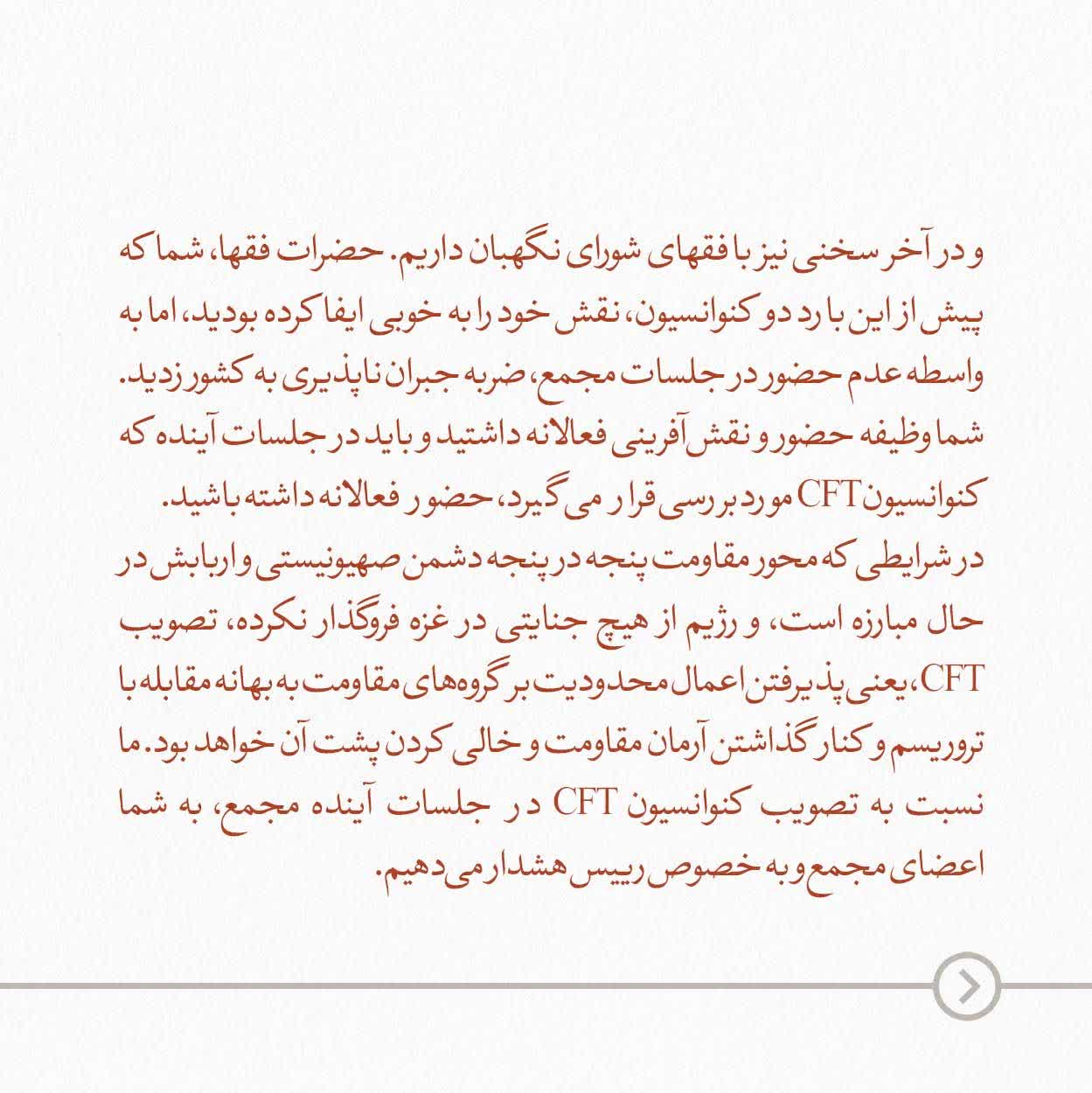 در شرایطی که محور مقاومت پنجه در پنجه دشمن صهیونیستی و اربابش در حال مبارزه است، و رژیم از هیچ جنایتی در غزه فروگذار نکرده، تصویب CFT، یعنی پذیرفتن اعمال محدودیت بر گروههای مقاومت به بهانه مقابله با تروریسم و کنار گذاشتن آرمان مقاومت و خالی کردن پشت آن خواهد بود. ما نسبت به تصویب کنوانسیون CFT در جلسات آینده مجمع، به شما اعضای مجمع و به خصوص رییس هشدار میدهیم.
