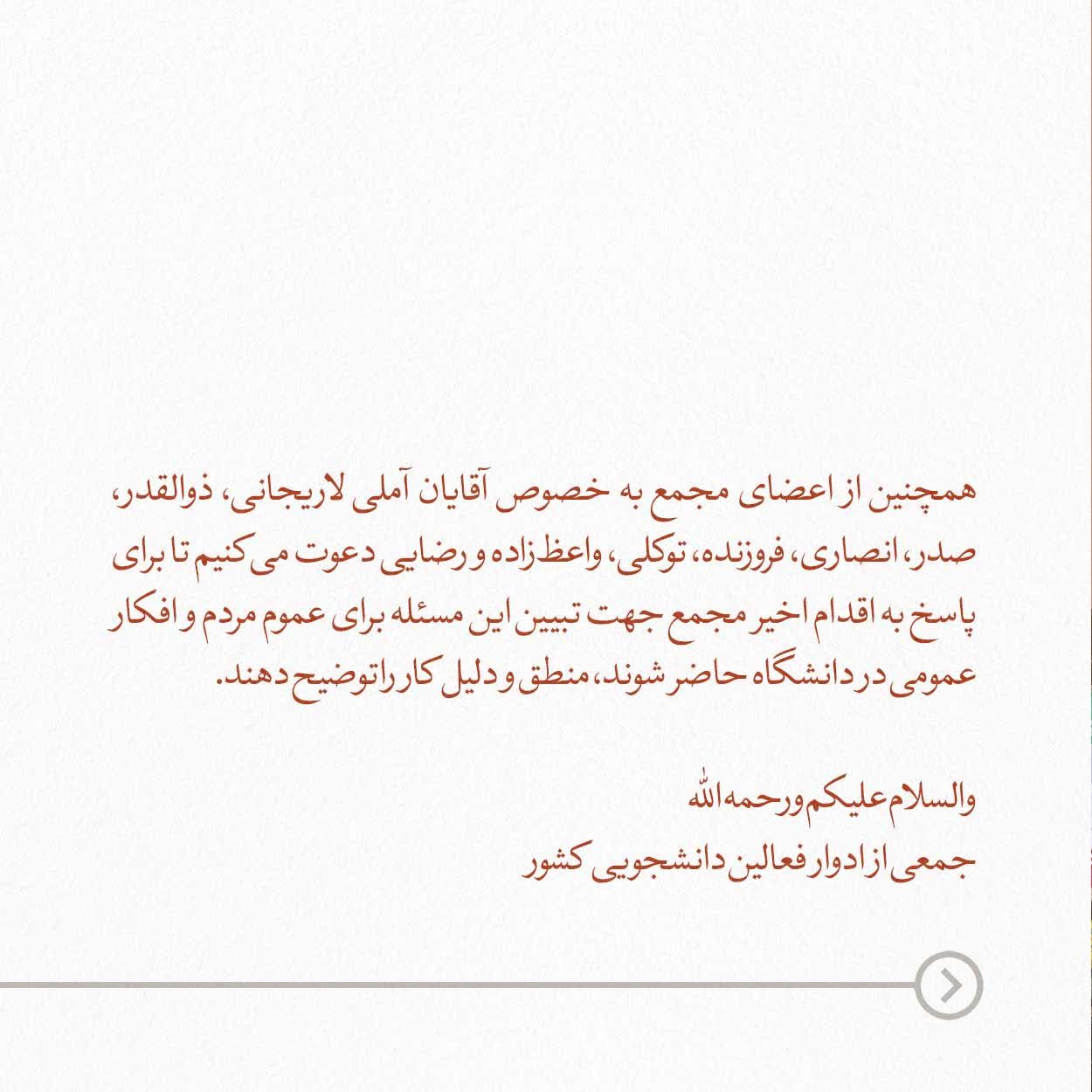 همچنین از اعضای مجمع به خصوص آقایان آملی لاریجانی، ذوالقدر، صدر، انصاری، فروزنده، توکلی، واعظزاده و رضایی دعوت میکنیم تا برای پاسخ به اقدام اخیر مجمع جهت تبیین این مسئله برای عموم مردم و افکار عمومی در دانشگاه حاضر شوند، منطق و دلیل کار را توضیح دهند.
