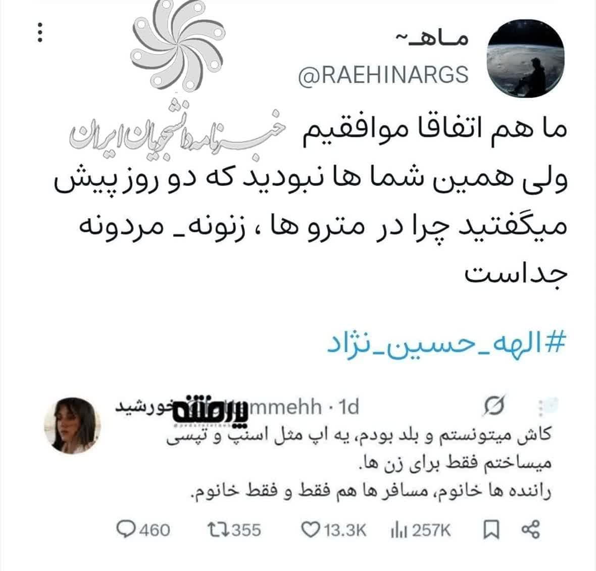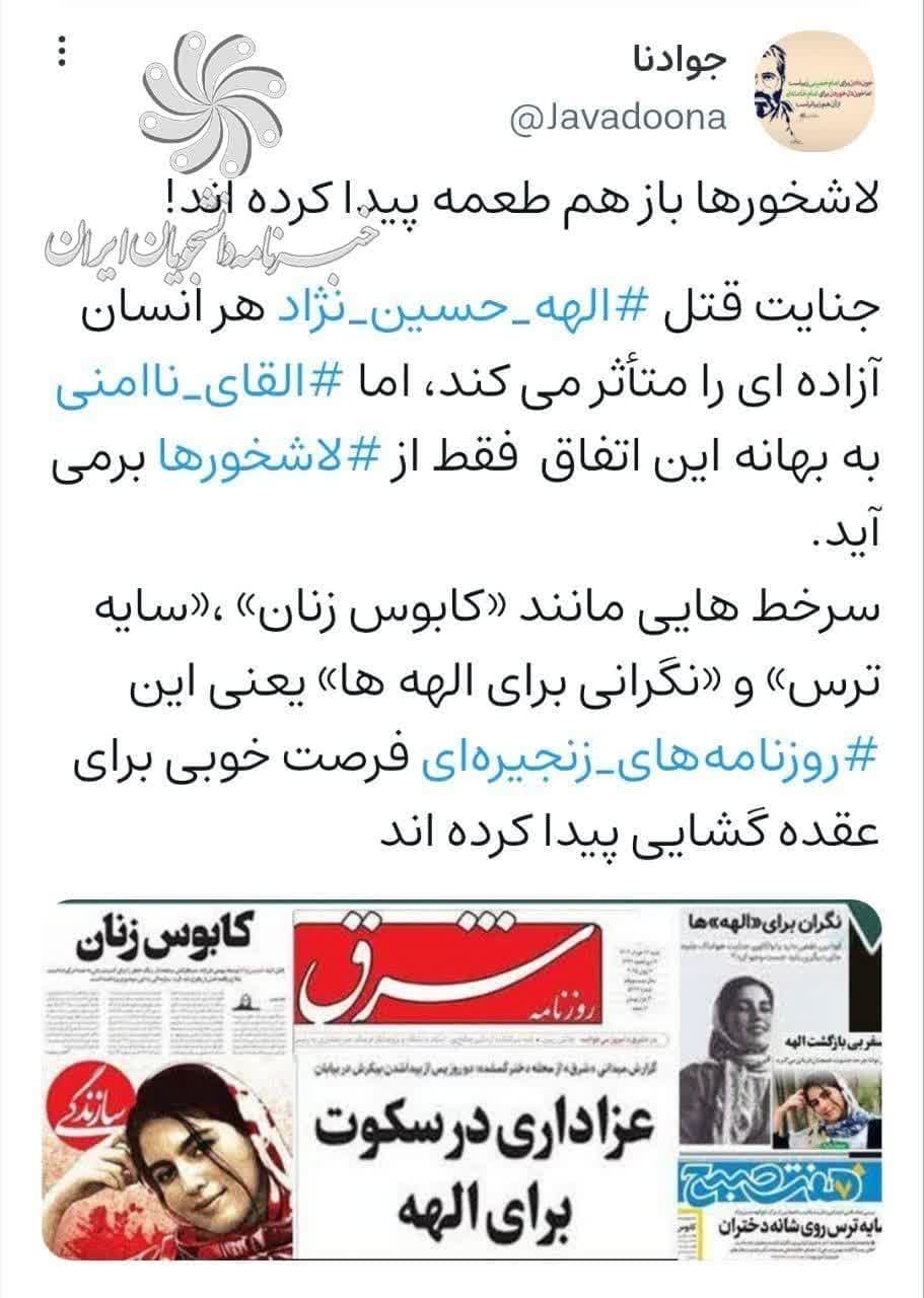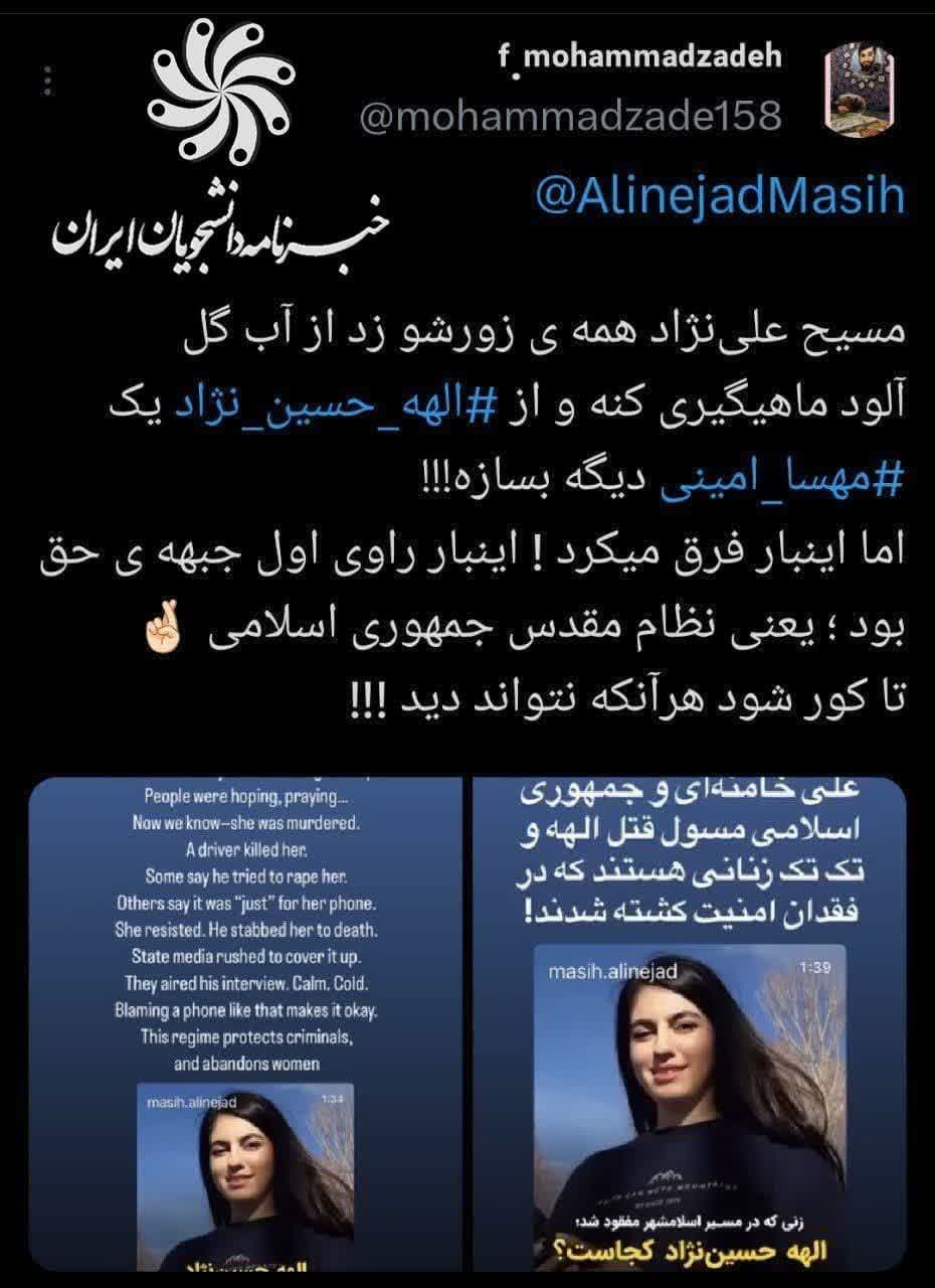 به گزارش «خبرنامه دانشجویان ایران»؛ الهه حسین نژاد دختر ۲۴ ساله‌ای که از ۴ خرداد مفقود شده بود، در راه منزل خود در اسلامشهر به دست راننده خودروی سواری به قتل رسیده است. از روز اول تلاش کردند ماجرا را یه مسائل مختلف ربط بدهند و فضای جامعه را ملتهب سازند. اما این بار تیرشان به سنگ خورد و هدف حاصل نشد.