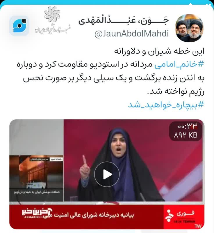 به گزارش خبرنگار شبکه های اجتماعی «خبرنامه دانشجویان ایران»؛ رژیم جعلی صهیونیستی در ادامه جنایات ددمنشانه خود، این بار آزادی را به گلوله بست و سازمان صداوسیما را مورد هدف قرار داد. سحر امامی مجری شبکه خبر، همزمان با حمله به استودیو و انفجار ساختمان نهتنها نترسید، هول نشد بلکه حماسهای دیگر آفرید و سیلی محکمی بر صورت متجاوزان زد.
