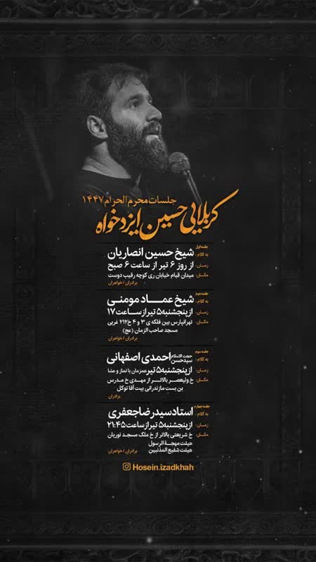 سخنرانان: شیخ حسین انصاریان/ شیخ عماد مؤمنی/ استاد سیدرضا جعفری/ حجت الاسلام احمدی اصفهانی