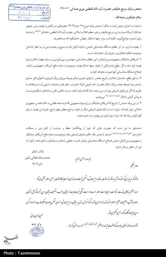 با تحیت و احترام و عرض ارادت و تشکر از صدور بیانیه مورخ 28 خرداد1404 حضرت عالی در واکنش به تهدید رئیس جمهور جنایتکار آمریکا نسبت به ترور مرجع عالیقدر و رهبر معظم انقلاب اسلامی حضرت آیت الله العظمی خامنهای دام ظله، و استدعا برای استمرار موضعگیری حکیمانه در برابر جبهه استکبار جهانی، همانگونه که مستحضرید: